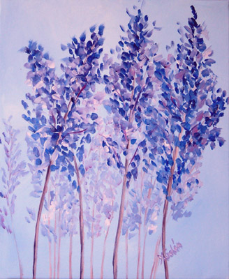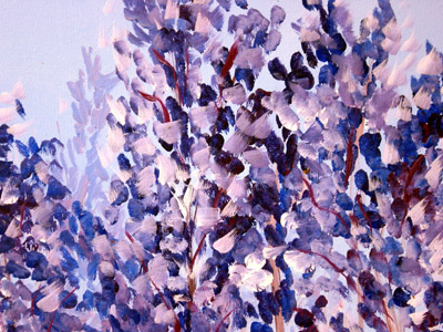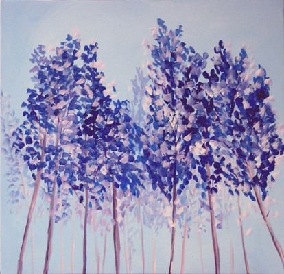 Tríptico de una fila de árboles dotados de un divertidos colores azules y lilas.