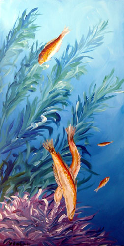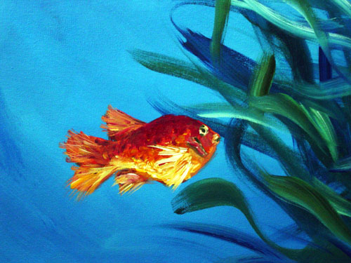 Divertido paisaje submarino con peces naranjas alimentandose de todas las algas del fondo.
